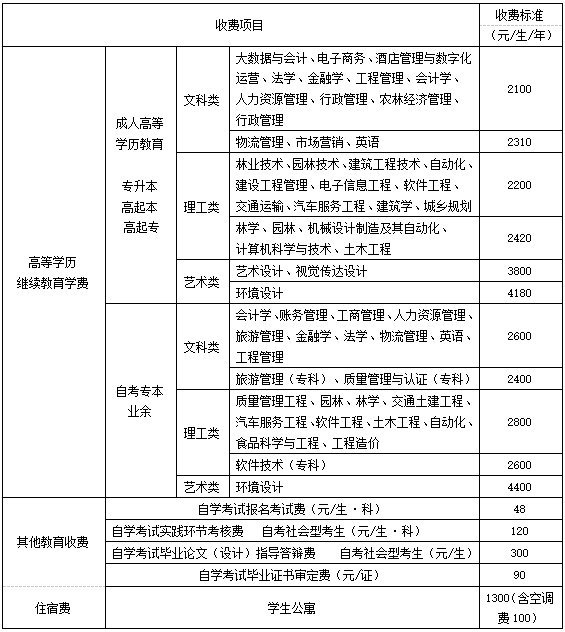 经湖南省教育厅、湖南省发展和改革委员会、湖南省财政厅批准,中南林业科技大学高等学历继续教育林学等9个国家级一流专业自2025级起学费标准上浮10%。2025级之前的学生按上浮前学费标准缴费。
