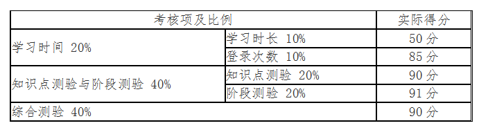 举例说明:社会考生甲2020年6月选择参加了《大学语文》的网络助学,并选择在2020年10月考期将课程过程性考核成绩计入课程总成绩,其网络过程性各考核项所取得的成绩如下表所示:
