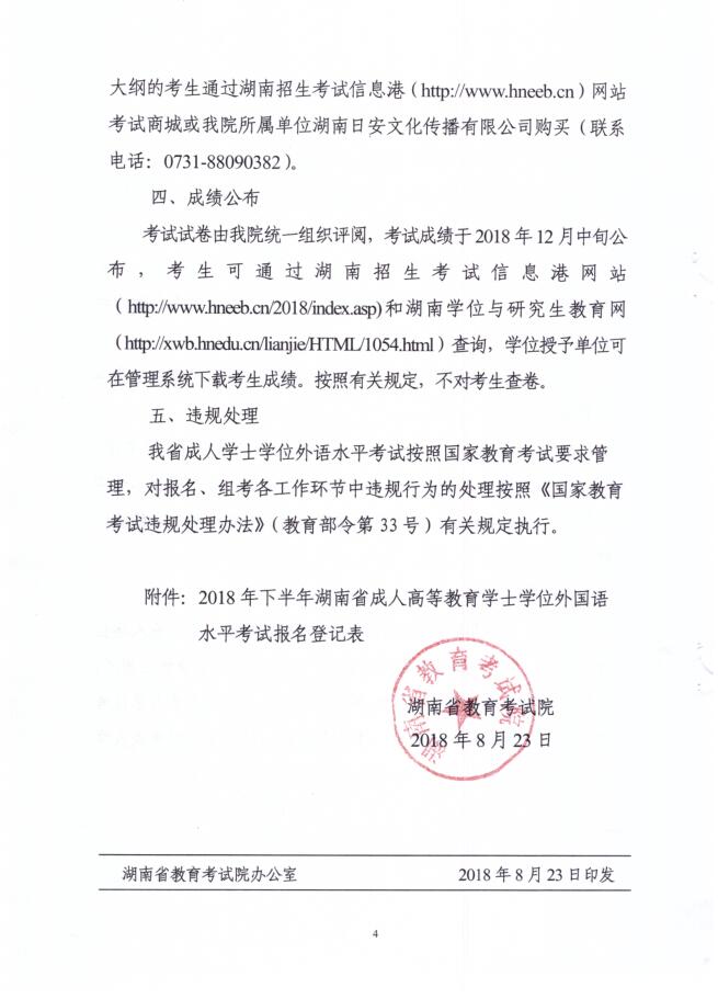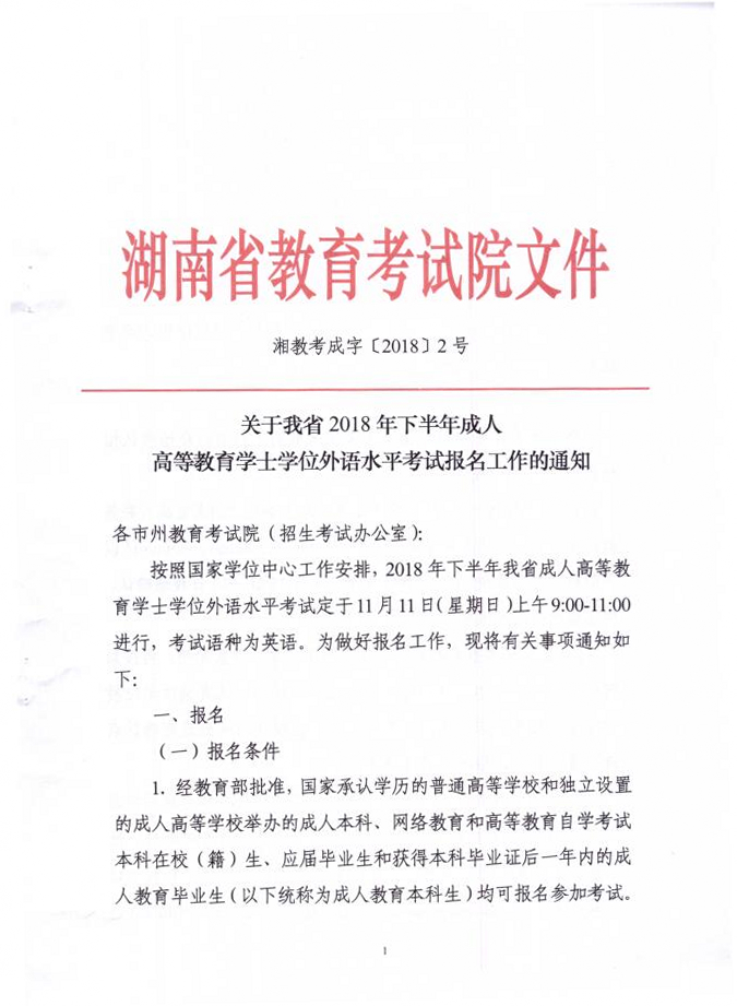 现将省考试院下发的关于今年下半年学位外语考试报名工作通知(湘教考成字〔2018〕2号)转发给你们,请将通知传达给待考学生,指导学生按照规定的时间和流程进行报考。所有考生在任意地点通过报名系统(http://cz.hneao.cn/xwwy)进行网上报名时可以选择自己就近的报名点和考点。