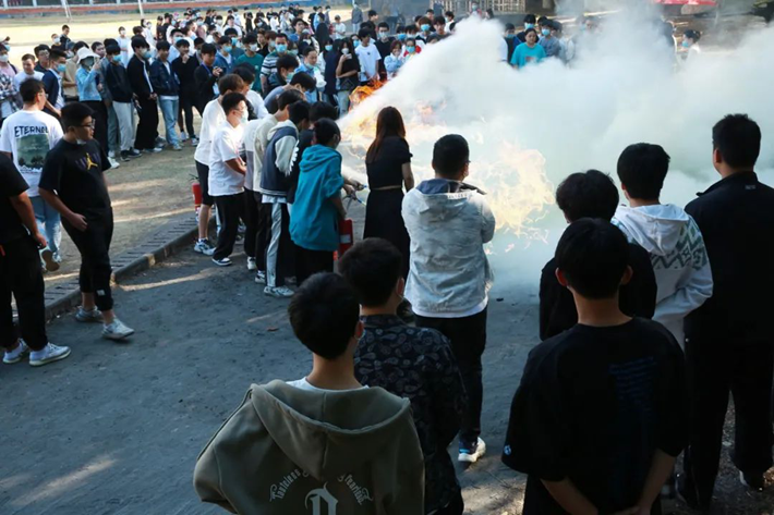 在现场演练环节,消防员先后在德业楼、南园操场和学生公寓三个场所进行现场逃生和消防器材灭火的实战演训。消防员现场指导参训师生正确使用干粉灭火器和手推式灭火器进行灭火。演练现场烟雾缭绕,模拟逼真的火场实况,让每一个参训人员都身临其境,懂得如何正确使用消防灭火设备,有序开展灭火、自救与逃生。