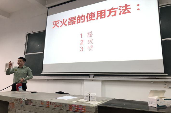 下午两点半,在德业楼110教室进行消防知识讲座。普消消防刘铁军教官通过讲解多起案例,展现了火灾酿成的悲剧和造成的巨大损失。他提醒大家宿舍的消防隐患主要是大功率电器和未拔的插头。他还介绍了火灾逃生步骤,不管是高层住户还是低层住户,首先打119呼救,拨打完求救电话后,低层住户可以用拧干的湿毛巾对折三次后捂住口鼻迅速逃离火源,高层住户和不方便逃生的住户可以到比较潮湿的环境等待救援,或者将醒目物体伸出窗外引起他人注意,教官特别强调,火灾时不能搭乘电梯,从门和窗进行逃生需谨慎,危险性很大。如果手边有灭火器,立即使用灭火器进行自救。最后,教官向大家介绍了干粉灭火器、二氧化碳灭火器、便携灭火器,并且教大家如何正确使用。