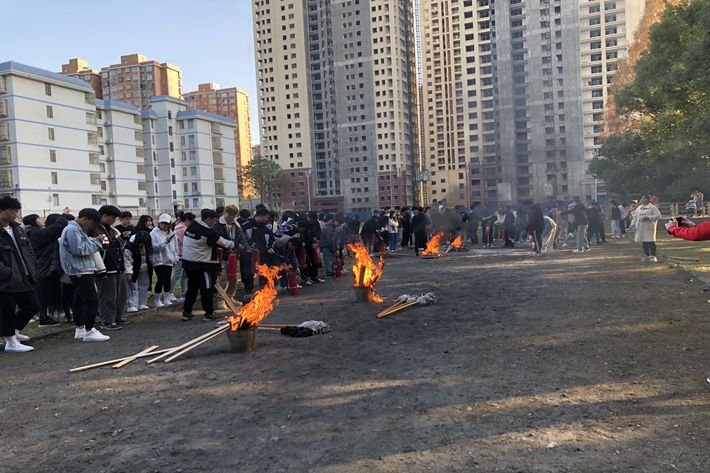 到操场后,进行灭火演练。操场上事先准备好了火盆,学生代表有序站好手持灭火器听口令进行灭火,其余学生有序在一旁进行观看学习。