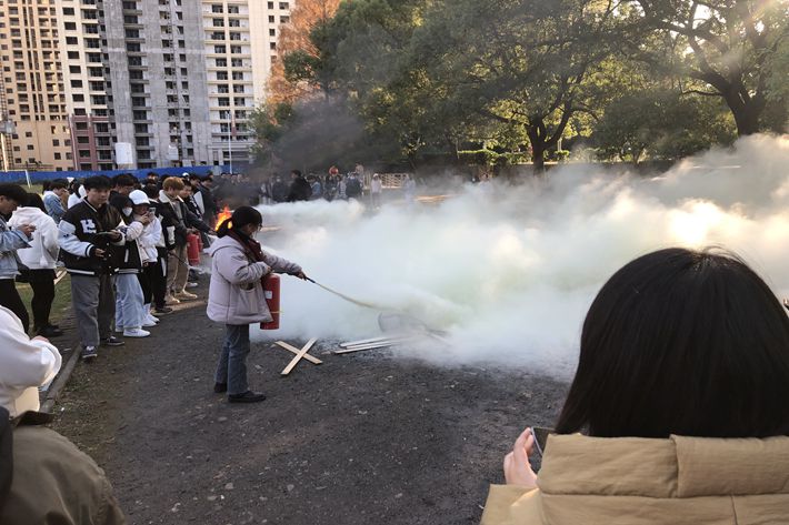 讲座结束后,教官组织了逃生演练和灭火演练。首先在德业楼110教室进行火灾逃生演练,大家有序疏散至操场。