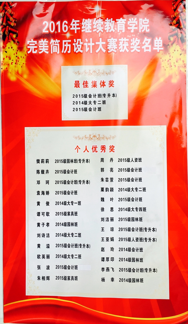 为提高我院学生的个人简历制作水平和动手操作能力,学院面向全体学生举办完美简历设计大赛活动。