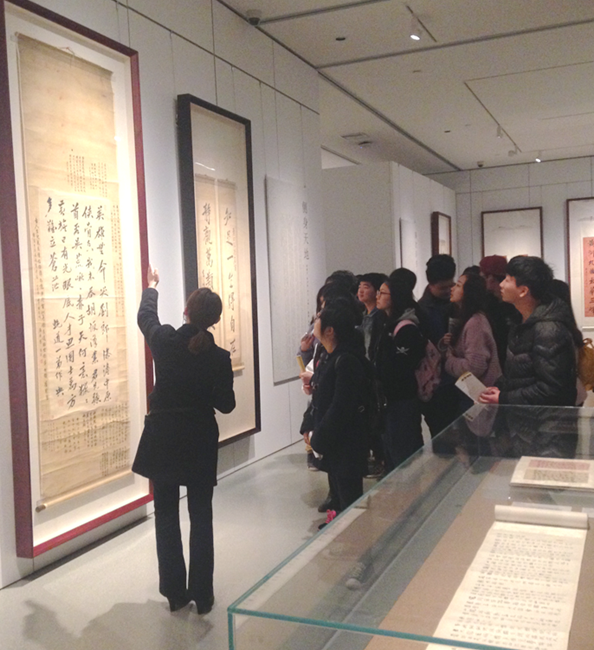 在讲解员的引导和解说中,同学们参观了博物馆展出的圆明园遗址十二生肖喷泉中的丑(牛)、申(猴)、寅(虎)、亥(猪)四尊铜质兽首;各历史时期的宗教金石雕像、青铜器皿;以及何绍基、左宗棠、毛泽东、沈从文、黄永玉等湖南名人大家的书法作品。同学们细细品味,纷纷观影留念。